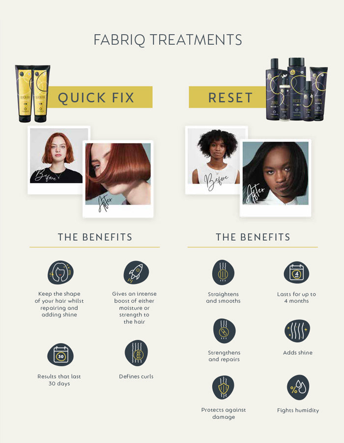 Fabriq’s unique blend of proteins repairs, strengthens and transforms all hair types.